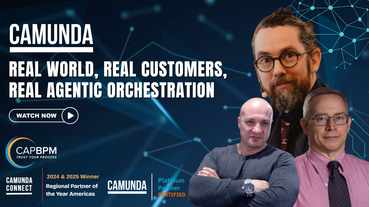 Camunda’s orchestration gives us that solid foundation—providing the stability we need while still enabling us to push forward with GenAI-driven innovations that improve care and operational efficiency. CapBPM has been an invaluable partner in this journey. Their expertise and guidance help us design and position solutions that respect the rigor of healthcare’s regulatory landscape while unlocking the promise of next-generation orchestration. CapBPM has given us the confidence to explore agentic orchestration with Camunda in a way that is innovative, responsible, and value-driven. Kudos to both of these excellent partners.